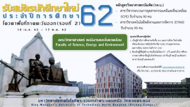 รับสมัครนักศึกษาใหม่โครงการโควตาพื้นภาคตะวันออก (รอบที่ 2) ปีการศึกษา 2562 คณะวิทยาศาสตร์ พลังงานและสิ่งแวดล้อม มจพ. วิทยาเขตระยอง EZ Webmaster May 2, 2019 คณะวิทยาศาสตร์ พลังงานและสิ่งแวดล้อม มจพ. วิทยาเขตระยอง รับสมัครนักศึกษาใหม่โครงการโควตาพื้นภาคตะวันออก (รอบที่ 2) ปีการศึกษา 2562 เข้าศึกษาต่อในระดับปริญญาตรี 4 ปี หลักสูตรวิทยาศาสตรบัณฑิต รวม 2 สาขาวิชา คือ สาขาวิชากระบวนการอุตสาหกรรมเคมีและสิ่งแวดล้อม (ICPE) รับจำนวน 90 คน และสาขาวิชาเทคโนโลยีพลังงานและการจัดการ (ETAM) รับจำนวน 90 คน รับสมัครผ่านระบบออนไลน์ ตั้งแต่บัดนี้ถึงวันที่ 17 พฤษภาคม 2562 ประกาศรายชื่อผู้มีสิทธิ์สอบสัมภาษณ์ วันที่ 20 พฤษภาคม 2562 สอบสัมภาษณ์ วันที่ 23 พฤษภาคม 2562… Continue Reading