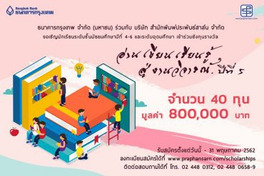 40 ทุนให้นักเรียน นักศึกษา ร่วมโครงการ “อ่าน เขียน เรียนรู้ สู่งานวิจารณ์ ปีที่ 5” tui sakrapee April 27, 2019 ธนาคารกรุงเทพ จำกัด (มหาชน) ร่วมกับ บริษัท สำนักพิมพ์ประพันธ์สาส์น จำกัด ขอเชิญน้องๆ นักเรียนชั้นมัธยมศึกษา ปีที่ 4-6 และ นิสิต นักศึกษาในระดับอุดมศึกษา เข้าร่วมโครงการอ่าน เขียน เรียนรู้ สู่งานวิจารณ์ ปีที่ 5 ชิงทุนรางวัล 20,000 บาท จำนวน 40 ทุนรางวัล เป็นจำนวนเงินทั้งสิ้น 800,000 บาท คุณสมบัติผู้สมัคร 1. เป็นผู้ที่กำลังศึกษาระดับชั้นมัธยมศึกษาปีที่ 4 – 6 หรือผู้ที่กำลังศึกษาอยู่ระดับอุดมศึกษา 2. ไม่เคยได้รับทุนรางวัลจากการจัดโครงการฯ ปีที่ 1 ปีที่ 2… Continue Reading
