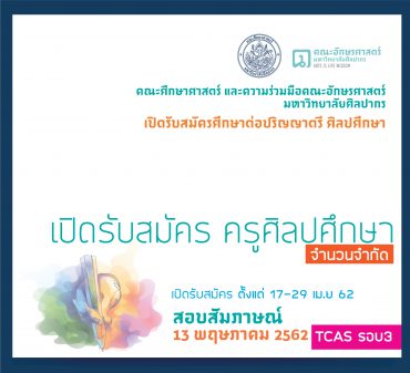 TCAS รอบ 3 รับตรงร่วมกัน (20คน) โครงการครูศิลปะสร้างสรรค์ ม.ศิลปากร 2562 EZ Webmaster April 18, 2019 คุณสมบัติเฉพาะ 1. มีผลการเรียนเฉลี่ยสะสม (GPAX) 5 ภาคการศึกษาไม่น้อยกว่า 2.00 (10 คะแนน) 2. มีผลการเรียนรายวิชากลุ่มสาระศิลปะไม่น้อยกว่า 3.00 (15 คะแนน) 3. เป็นผู้มีความสามารถทางงานศิลปะ หรือเคยร่วมกิจกรรมการแข่งขันทางด้านศิลปะ (25 คะแนน) หรือ 4. เป็นผู้ได้รับรางวัลทางด้านศิลปะที่เกี่ยวข้องกับทัศนศิลป์ หรือดนตรี หรือนาฏศิลป์ (ระดับเขตพื้นที่การศึกษาจังหวัด/ระดับภูมิภาค/ระดับชาติ/ระดับนานาชาติ) (25 คะแนน) วิธีการคัดเลือก 1. พิจารณาจากเกียรติบัตรผลงานด้านศิลปะ และใบแสดงผลการเรียน (ปพ.1) และแฟ้มแสดงผลงานที่นำมานำเสนอในวันสอบสัมภาษณ์ (1) การประกวดแข่งขันศิลปะในระดับเขตพื้นที่การศึกษาจังหวัด/ระดับภูมิภาค/ระดับชาติ/ระดับนานาชาติ (2) เอกสารที่แสดงถึงการเข้าร่วมการแข่งขัน หรือการประกวดศิลปกรรม (ทัศนศิลป์) **หมายเหตุ เอกสารข้อ (1)… Continue Reading