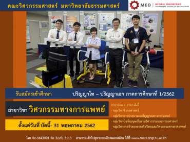 วิศวกรรมศาสตร์ มธ. เปิดรับ ป.โท-เอก สาขาวิชาวิศวกรรมทางการแพทย์ EZ Webmaster March 26, 2019 คณะวิศวกรรมศาสตร์ มหาวิทยาลัยธรรมศาสตร์ ศูนย์รังสิต ประกาศรับสมัครบุคคลเข้าศึกษา ระดับปริญญาโท-ปริญญาเอก สาขาวิชาวิศวกรรมทางการแพทย์ ภาคการศึกษาที่ 1/2562 ตั้งแต่บัดนี้ – 31 พฤษภาคม พ.ศ. 2562 สาขาย่อย 4 สาขา ดังนี้ o กลุ่มวิชาชีวกลศาสตร์ o กลุ่มวิชาการประมวลผลสัญญาณ ทางการแพทย์ o กลุ่มวิชาปัจจัยมนุษย์ในงานวิศวกรรมและการยศาสตร์ o กลุ่มวิชาการจำลองทางสรีรวิทยาและวิศวกรรมทางการแพทย์ โทร 02 5643001-9 ต่อ 3220, 3113 โทรสาร 02 5643016 สามารถเข้าไปดูรายละเอียดได้ที่ www.med.engr.tu.ac.th Continue Reading