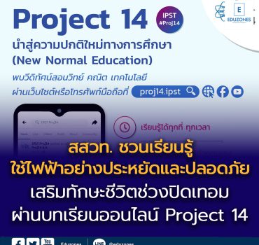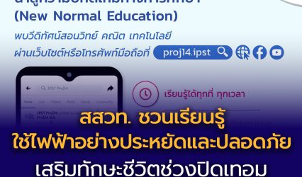 Blogครู-อาจารย์นักเรียน สสวท. ชวนเรียนรู้ “ใช้ไฟฟ้าอย่างประหยัดและปลอดภัย” เสริมทักษะชีวิตช่วงปิดเทอม ผ่านบทเรียนออนไลน์ Project 14 สถาบันส่งเสริมการสอนวิทยาศาสตร์และเทคโนโลยี (สสวท.) เชิญชวนครู นักเรียน และผู้สนใจ ใช้เวลาช่วงปิดเทอมอย่างสร้างสรรค์ เสริมทักษะชีวิตผ่านการเรียนรู้ออนไลน์ กับบทเรียน Project 14 สสวท. เรื่อง “ใช้ไฟฟ้าอย่างประหยัดและปลอดภัยได้อย่างไร” จากวีดิทัศน์กิจกรรมที่ 1.3 ในหนังสือเรียนวิทยาศาสตร์และเทคโนโลยี ป.3 เล่ม 2 หน่วยพลังงานกับชีวิต โดยเนื้อหานำเสนอแนวทางการใช้ไฟฟ้าอย่างเหมาะสมในชีวิตประจำวัน เช่น ปิดไฟและถอดปลั๊กเมื่อไม่ใช้งาน…