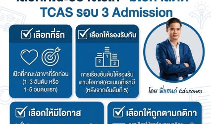 BlogTCASข่าวเด่นนักเรียน เลือกคณะอย่างไรให้ “มีโอกาสติด” TCAS รอบ 3 Admission โดย พี่แฮนด์ Eduzones EZ Webmaster April 24, 2026 🎯 เลือกคณะอย่างไรให้ “มีโอกาสติด” TCAS รอบ 3 Admission โดย พี่แฮนด์ Eduzones หนึ่งในคำถามที่เด็ก TCAS ถามกันมากที่สุดทุกปีคือ 👉 “คณะที่อยากเรียน คะแนนไม่ถึง…