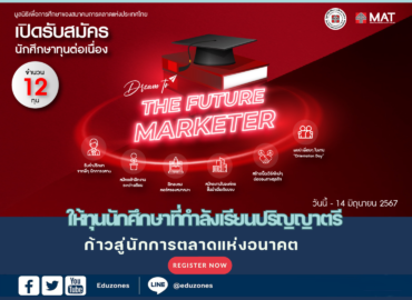เรียนฟรี! คณะแพทยศาสตร์ มช. เปิดคอร์ส “กายวิภาคศาสตร์มนุษย์พื้นฐาน” เรียนออนไลน์ได้ถึง 31 ก.ค. 2569 EZ WebmasterApril 22, 2026 🧠✨ เรียนฟรี! คณะแพทยศาสตร์ มช. เปิดคอร์ส “กายวิภาคศาสตร์มนุษย์พื้นฐาน” เรียนออนไลน์ได้ถึง 31 ก.ค. 2569 โอกาสดีสำหรับน้อง ๆ นักเรียน นักศึกษา และผู้ที่สนใจสายสุขภาพ ล่าสุด คณะแพทยศาสตร์ มหาวิทยาลัยเชียงใหม่… เปิดจักรวาล “สายพยาบาล” ✨ ชวนน้อง ม.ปลาย ร่วมงานใหญ่แห่งปี จากสถาบันการพยาบาลศรีสวรินทิรา EZ WebmasterApril 19, 2026 🏥 เปิดจักรวาล “สายพยาบาล” ✨ ชวนน้อง ม.ปลาย ร่วมงานใหญ่แห่งปี จากสถาบันการพยาบาลศรีสวรินทิรา ใครสนใจสายสุขภาพ ห้ามพลาด! ✨สถาบันการพยาบาลศรีสวรินทิรา สภากาชาดไทย ขอเชิญชวนน้อง ๆ ระดับมัธยมปลาย และประชาชนทั่วไป เข้าร่วมกิจกรรมเปิดบ้านสุดยิ่งใหญ่ ภายใต้ธีม… ม.เกริก ผนึกกำลัง 14 สถาบันอุดมศึกษาชั้นนำ ร่วมลงนาม MOU ยกระดับการพัฒนาสังคมและงานวิจัยระดับชาติ tui sakrapeeApril 15, 2026 มหาวิทยาลัยเกริก ผนึกกำลัง 14 สถาบันอุดมศึกษาชั้นนำ ร่วมลงนาม MOU ยกระดับการพัฒนาสังคมและงานวิจัยระดับชาติ ณ สถาบันบัณฑิตพัฒนบริหารศาสตร์ (NIDA) วันที่ 9 เมษายน 2569 ณ สถาบันบัณฑิตพัฒนบริหารศาสตร์ (NIDA) มหาวิทยาลัยเกริก… ราชมงคลพระนคร ร่วมสนับสนุนกิจกรรมในงานกระตุ้นเศรษฐกิจรัชดา-ประชาชื่น สำนักงานเขตบางซื่อ tui sakrapeeApril 9, 2026 ดร.ณัฐวรพล รัชสิริวัชรบุล อธิการบดีมหาวิทยาลัยเทคโนโลยีราชมงคลพระนคร มอบหมายให้ ผศ.ศรัทธา แข่งเพ็ญแข ผู้ช่วยอธิการบดี เข้าร่วมประชุมและประสานงาน โดยมีผศ.ดร.ยุทธภูมิ สุวรรณเวช รองอธิการบดี เป็นผู้กำกับดูแลในการสนับสนุน จัดกิจกรรมในงานกระตุ้นเศรษฐกิจรัชดา-ประชาชื่น โดยสำนักงานเขตบางซื่อ ซึ่งจัดในพื้นที่บริเวณสวนสุขภาพแยกประชานุกูล ระหว่างวันที่ 19-27 มี.ค.2569… Search for: Search Classic Blog The Future Marketer เปิดให้ทุนนักศึกษาที่กำลังเรียนปริญญาตรี ก้าวสู่นักการตลาดแห่งอนาคต tui sakrapee March 16, 2024 The Future Marketer ทุนการศึกษา ที่ให้มากกว่าโอกาสทางการศึกษา เพื่อสร้างนักการตลาดแห่งอนาคต รับสมัคร จำนวน 12 ทุน ทุนการศึกษาละ 36,000 บาท ต่อปีการศึกษา พร้อมโอกาสเข้าร่วมกิจกรรมสัมมนาหลักสูตรต่างๆ ฟรี! เปิดรับสมัคร วันนี้ – 14 มิถุนายน 2567 สิ่งที่ได้รับ ทุนการศึกษาต่อเนื่อง ทุนละ 36,000 บาท ต่อปีการศึกษา โอกาสฝึกอบรมกับคอร์สของสมาคมการตลาด ฟรี! โอกาสรับคำปรึกษา จากพี่ๆ นักการตลาดยุคใหม่ ที่จะให้คำแนะนำเป็นโค้ชให้คำปรึกษาแก่น้องๆ โอกาสสมัครเข้าฝึกงานด้านการตลาดระหว่างเรียน โอกาสในการสมัครงาน ในองค์กรชั้นนำเมื่อเรียนจบ โอกาสสร้างเน็ตเวิร์คใหม่ๆ เพื่อแลกเปลี่ยนความรู้และต่อยอดทางธุรกิจ ได้พบปะเพื่อนๆ ที่รั
