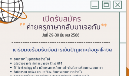 ครู-อาจารย์ ว.ศิลปศาสตร์ ม.รังสิต จัดกิจกรรม “ค่ายครูภาษากลับมาเจอกัน” EZ Webmaster March 15, 2023 วิทยาลัยศิลปศาสตร์ มหาวิทยาลัยรังสิต จัดกิจกรรม “ค่ายครูภาษากลับมาเจอกัน” เชิญชวนอาจารย์ และคุณครูที่สอนภาษาเข้าร่วมกิจกรรม โดยมีรายละเอียดดังนี้ ค่ายครูภาษากลับมาเจอกัน จัดขึ้นระหว่างวันที่ 29-30 มีนาคม 2566 รับสมัครจำนวน 35 คน จัดขึ้นที่มหาวิทยาลัยรังสิต…