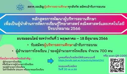 ครู-อาจารย์ สสวท. เร่งสร้างผู้นำจัดการเรียนรู้วิทย์ คณิต เทคโนโลยี เดินหน้าจัดอบรมใหญ่ผู้บริหารสถานศึกษาทุกสังกัด สมัครฟรีถึง 20 เมษายนนี้ EZ Webmaster March 9, 2023 สถาบันส่งเสริมการสอนวิทยาศาสตร์และเทคโนโลยี (สสวท.) ขอเชิญผู้บริหารสถานศึกษาทุกสังกัด อบรมหลักสูตรการพัฒนาผู้บริหารสถานศึกษาเพื่อเป็นผู้นำด้านการจัดการเรียนรู้วิทยาศาสตร์ คณิตศาสตร์และเทคโนโลยี ปีงบประมาณ 2566 อบรมออนไลน์ฟรีผ่านโปรแกรม Zoom ระหว่างวันที่ 1 พฤษภาคม – 18 มิถุนายน 2566 จำนวนในการอบรม 30 ชั่วโมง สมัครได้ตั้งแต่บัดนี้หมดเขตรับสมัคร 20 เมษายน 2566 ดูรายละเอียดและสมัครที่ https://endb.ipst.ac.th/activity/detail/241 การอบรมหลักสูตรนี้มุ่งให้ผู้บริหารสถานศึกษาได้รับองค์ความรู้ สามารถประยุกต์องค์ความรู้ในการพัฒนาคุณภาพการจัดการเรียนรู้ในโรงเรียนได้อย่างเป็นรูปธรรม และสร้างเครือข่ายผู้บริหารเพื่อการแลกเปลี่ยนเรียนรู้อย่างกว้างขวางอีกด้วย