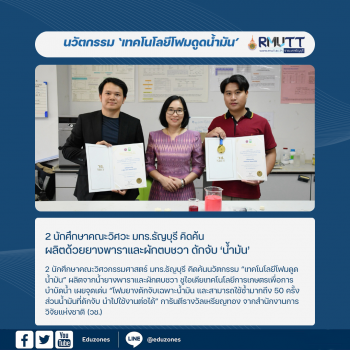 นวัตกรรม “เทคโนโลยีโฟมดูดน้ำมัน” ผลิตด้วยยางพาราและผักตบชวา ดักจับ ‘น้ำมัน’ tui sakrapee March 5, 2024 2 นักศึกษาคณะวิศวกรรมศาสตร์ มทร.ธัญบุรี คิดค้นนวัตกรรม “เทคโนโลยีโฟมดูดน้ำมัน” ผลิตจากน้ำยางพาราและผักตบชวา ชูไอเดียเทคโนโลยีการเกษตรเพื่อการบำบัดน้ำ เผยจุดเด่น “โฟมยางดักจับเฉพาะน้ำมัน และสามารถใช้ซ้ำมากถึง 50 ครั้ง ส่วนน้ำมันที่ดักจับ นำไปใช้งานต่อได้” การันตีรางวัลเหรียญทอง จากสำนักงานการวิจัยแห่งชาติ (วช.) นายภพธร คล้ายเข็ม (เนม) นักศึกษาปริญญาโท ภาควิชาวิศวกรรมวัสดุและโลหการ และนายพฤติพงศ์ พันธมนัสโสภา (เด่น) นักศึกษาปริญญาเอก คณะวิศวกรรมศาสตร์ มหาวิทยาลัยเทคโนโลยีราชมงคลธัญบุรี (มทร.ธัญบุรี) คิดค้นและพัฒนาผลงานเทคโนโลยีโฟมดูดน้ำมัน (Green Oil-Absorbing Technology) โดยมี รศ.ดร.วารุณี อริยวิริยะนันท์ จาก มทร.ธัญบุรี และ ศ.ดร.สนอง เอกสิทธิ์ จากจุฬาลงกรณ์มหาวิทยาลัย เป็นอาจารย์ที่ปรึกษา ล่าสุดได้รับรางวัลเหรียญทอง (Gold Awards) ระดับอุดมศึกษา… Continue Reading
