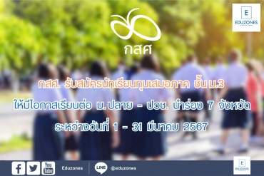 EZ Webmaster March 5, 2024 กสศ. รับสมัครนักเรียนทุนเสมอภาคชั้น ม.3 ให้มีโอกาสเรียนต่อ ม.ปลาย – ปวช. นำร่อง 7 จังหวัด ระหว่างวันที่ 1-31 มีนาคม 2567 EZ Webmaster March 5, 2024 กสศ. รับสมัครนักเรียนทุนเสมอภาคชั้น ม.3 ให้มีโอกาสเรียนต่อ ม.ปลาย – ปวช. นำร่อง 7 จังหวัด ระหว่างวันที่ 1-31 มีนาคม 2567 เมื่อวันที่ ๒๗ กุมภาพันธ์ พ.ศ.๒๕๖๗ กองทุนเพื่อความเสมอภาคทางการศึกษา (กสศ.) โดยสำนักพัฒนาหลักประกันโอกาสทางการศึกษา จัดประชุมชี้แจงการดำเนินงานช่วยเหลือนักเรียนทุนเสมอภาคให้ได้รับโอกาสทางการศึกษาที่สูงขึ้นสำหรับสถานศึกษานำร่อง ปีการศึกษา 1/2567 ร่วมกับตัวแทนครูในเขตพื้นที่การศึกษา 30 เขต จาก 7 จังหวัด ได้แก่ กาญจนบุรี… Continue Reading