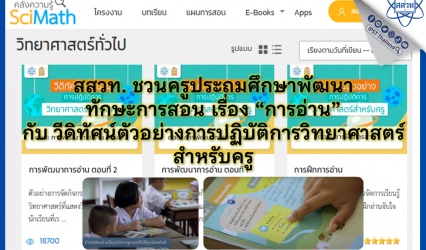 นักเรียน สสวท. ชวนครูประถมศึกษาพัฒนาทักษะการสอน เรื่อง “การอ่าน” กับ วีดิทัศน์ตัวอย่างการปฏิบัติการวิทยาศาสตร์สำหรับครู EZ Webmaster February 6, 2023 อ่าน อ่าน อ่าน ประตูสำคัญอีกบานของการเรียนรู้ สถาบันส่งเสริมการสอนวิทยาศาสตร์และเทคโนโลยี (สสวท.) ชวนคุณครูประถมศึกษาตอนต้นพัฒนาการจัดการเรียนการสอน เรื่อง ”การอ่าน” กับ วีดิทัศน์ตัวอย่างการปฏิบัติการวิทยาศาสตร์สำหรับครู จัดเต็ม 4 ตอนสอนสนุกได้แก่ การฝึกการอ่าน การพัฒนาการอ่าน ตอนที่ 1 – 3 ชมตัวอย่างการจัดกิจกรรมการจัดการเรียนรู้วิทยาศาสตร์ที่แสดงวิธีการฝึกอ่านจับใจความสำคัญสำหรับนักเรียนที่กำลังพัฒนาทักษะการอ่าน แนวทาง วิธีการ การกระตุ้นความสนใจเพื่อเตรียมความพร้อมของชั้นเรียนก่อนนำเข้าเรื่อง คลิกเลยที่คลังความรู้ SciMath สสวท. https://www.scimath.org/video–science?start=144