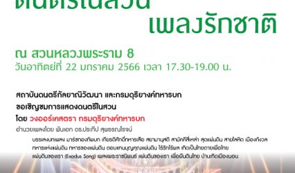 Blogกิจกรรม สถาบันดนตรีกัลยาณิวัฒนา และกองดุริยางค์ทหารบก ชวนร่วมชม “ดนตรีในสวน…เพลงรักชาติ” อาทิตย์ที่ 22 ม.ค.นี้ ณ สวนหลวงพระราม 8 tui sakrapee January 21, 2023 สถาบันดนตรีกัลยาณิวัฒนา และกองดุริยางค์ทหารบก มีความยินดีขอเชิญทุกท่านร่วมชมการแสดง “ดนตรีในสวน…เพลงรักชาติ” ณ สวนหลวงพระราม 8 บางยี่ขัน บางพลัด กทม เวลา 17.30-19.00 น. บรรเลงโดยวงออร์เคสตรา กรมดุริยางค์ทหารบก อำนวยเพลงโดย…