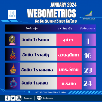 “สวนสุนันทา” แชมป์ราชภัฏ 19 สมัย “มทร.อีสาน” ที่ 1 ราชมงคล “ม.รังสิต” ยึดที่ 1 ม.เอกชน “จุฬาฯ” ยืน 1 ประเทศ จากอันดับ Webometrics Ranking January 2024 tui sakrapee January 30, 2024 “จุฬาฯ” ยังครองที่ 1 ประเทศ ส่วน “สวนสุนันทา” ยังยืนตำแหน่งแชมป์ราชภัฏยาวนาน 19 สมัย “มทร.อีสาน” ครองที่ 1 ราชมงคล ด้าน ม.รังสิต ยังที่ 1 ม.เอกชนอีกครั้งจากอันดับ Webometrics Ranking Universities: January 2024 Edition 2024.1.0 ………………………………………………………………………………………… Cybermetrics Lab แห่งสภาวิจัย (CSIC) ประเทศสเปน ได้ประกาศผลการจัดอันดับมหาวิทยาลัยทั่วโลกประจำเดือนมกราคม 2024 Edition 2024.1.0 แล้ว ทั้งนี้ข้อมูลอาจจะมีการเปลี่ยนแปลงอีกครั้ง ………………………………………………………………………………………. จุฬาฯยังยืนที่ 1 ประเทศไทย อันดับรวมมหาวิทยาลัยของประเทศไทย… Continue Reading
