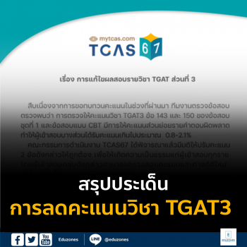 EZ Webmaster January 15, 2024 สรุปประเด็นการลดคะแนนวิชา “TGAT3” EZ Webmaster January 15, 2024 จากกรณีดราม่าการคิดคะแนนวิชา TGAT3 ที่ทำให้เกิดกระแสวิพากษ์วิจารณ์การทำงานของทปอ. วันนี้ทาง eduzones จะมาไล่เรียงลำดับเหตุการณ์ดังกล่าวว่ามีที่มาที่ไปอย่างไร 1. เริ่มต้นจากเมื่อวันที่ 7 มกราคมที่ผ่านมา ทางทปอ. ได้ประกาศผลคะแนนสอบวิชา TGAT-TPAT 2-5 ซึ่งเมื่อตรวจสอบก็ได้พบความผิดปกติในส่วนของการให้คะแนนวิชา TGAT3 ส่วนที่ 1 การสร้างคุณค่าและนวัตกรรม ว่ามีการให้คะแนนแตกต่างจากปีที่แล้ว 2. โดยปีนี้มีนักเรียนหลายคนได้คะแนน 0 คะแนนในบางข้อของพาร์ทนี้ ซึ่งผิดไปจากแนวทางการให้คะแนนที่ทางทปอ. ระบุไว้ใน Test Blueprint หรือโครงสร้างข้อสอบภายในเว็บ (https://www.mytcas.com/blueprint/tgat3-93/) 3. โดยใน… Continue Reading
