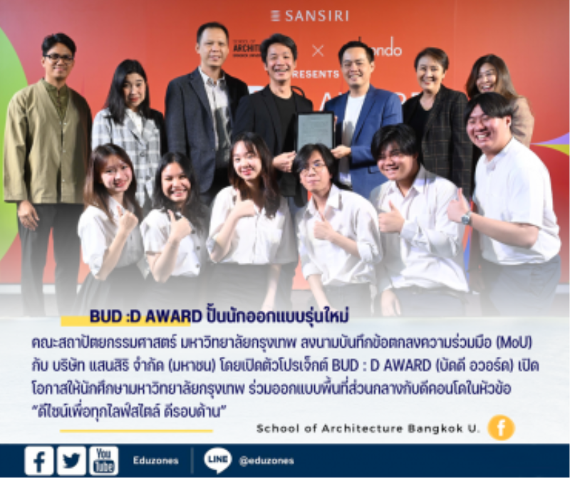 ม.กรุงเทพ จับมือ แสนสิริ เปิดตัว BUD :D AWARD ปั้นนักออกแบบรุ่นใหม่ tui sakrapee January 15, 2024 คณะสถาปัตยกรรมศาสตร์ มหาวิทยาลัยกรุงเทพ ลงนามบันทึกข้อตกลงความร่วมมือ (MoU) กับ บริษัท แสนสิริ จำกัด (มหาชน) โดยมี ผศ.ดร.ฤทธิรงค์ จุฑาพฤฒิกร รักษาการคณบดีคณะสถาปัตยกรรมศาสตร์ และ นายองอาจ สุวรรณกุล ผู้ช่วยกรรมการผู้จัดการอาวุโส ฝ่ายพัฒนาโครงการคอนโดมิเนียม เป็นผู้ลงนาม เปิดตัวโปรเจ็กต์ BUD : D AWARD (บัดดี อวอร์ด) เปิดโอกาสให้นักศึกษามหาวิทยาลัยกรุงเทพ ร่วมออกแบบพื้นที่ส่วนกลางกับดีคอนโดในหัวข้อ “ดีไซน์เพื่อทุกไลฟ์สไตล์ ดีรอบด้าน” โดยผลงานที่ชนะรางวัลและ Popular Vote จะได้รับเงินรางวัลมูลค่ากว่า 100,000 บาท พร้อมโอกาสฝึกงานกับทีมออกแบบจากแสนสิริ รวมทั้งผลงานการออกแบบจากแนวคิดที่เหมาะสมและตอบโจทย์มากที่สุดจะถูกนำมาเป็นส่วนหนึ่งของแนวทางในการออกแบบพื้นที่ส่วนกลางของคอนโดมิเนียมภายใต้แบรนด์ ดีคอนโด ติดตามรายละเอียดกิจกรรมได้ที่ Facebook: คณะสถาปัตยกรรมศาสตร์… Continue Reading