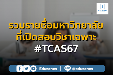 EZ Webmaster January 10, 2024 รวมรายชื่อมหาวิทยาลัยที่เปิดสอบวิชาเฉพาะใน #TCAS67 EZ Webmaster January 10, 2024 “การสอบวิชาเฉพาะ” เป็นการสอบเพื่อวัดความรู้ความสามารถที่แต่ละมหาวิทยาลัยจัดสอบขึ้นเอง เพื่อคัดเลือกบุคคลเข้ารับการศึกษาต่อในสาขาวิชาต่าง ๆ ซึ่งคะแนนจะถูกนำมาใช้คำนวณผลในรอบ 2 Quota และรอบ 3 Admission ตามเกณฑ์ที่ทางมหาวิทยาลัยกำหนด และวิชาที่ใช้สอบนั้นก็จะแตกต่างกันไปตามแต่ละคณะ/สาขาวิชา โดยวันนี้ทาง Eduzones ได้รวมรวมรายชื่อมหาวิทยาลัยที่เปิดสอบวิชาเฉพาะมาทั้งหมด 7 มหาวิทยาลัย ซึ่งจะมีที่ไหนกันบ้างนั้น ไปดูกันได้เลย 1. จุฬาลงกรณ์มหาวิทยาลัย วันรับสมัครสอบ : 14 – 23 ก.พ. 67 วันสอบ : 24… Continue Reading