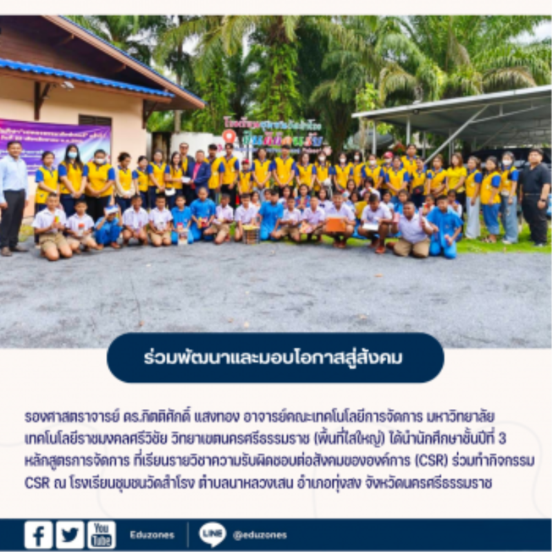 tui sakrapee November 14, 2023 มทร.ศรีวิชัย (ไสใหญ่) นำนักศึกษาร่วมพัฒนาและมอบโอกาสสู่สังคม tui sakrapee November 14, 2023 คณะเทคโนโลยีการจัดการ มทร.ศรีวิชัย (ไสใหญ่) ร่วมพัฒนาและมอบโอกาสสู่สังคม (CSR) ภายใต้วิสัยทัศน์ ” มหาวิทยาลัยนวัตกรรมเพื่อสังคม “ รองศาสตราจารย์ ดร.กิตติศักดิ์ แสงทอง อาจารย์คณะเทคโนโลยีการจัดการ มหาวิทยาลัยเทคโนโลยีราชมงคลศรีวิชัย วิทยาเขตนครศรีธรรมราช (พื้นที่ไสใหญ่) ได้นำนักศึกษาชั้นปีที่ 3 หลักสูตรการจัดการ ที่เรียนรายวิชาความรับผิดชอบต่อสังคมขององค์การ (CSR) ร่วมทำกิจกรรม CSR ณ โรงเรียนชุมชนวัดสำโรง ตำบลนาหลวงเสน อำเภอทุ่งสง จังหวัดนครศรีธรรมราช กิจกรรมครั้งนี้ทางนักศึกษาได้เชิญชวนไปยังองค์การภาคธุรกิจ ประกอบด้วยร้านค้า ห้างหุ้นส่วน และบริษัท… Continue Reading