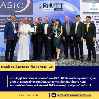 มทร.ธัญบุรี คว้า 2 รางวัลใหญ่จาก “ASIC” การันตีคุณภาพการศึกษาระดับนานาชาติ tui sakrapee October 30, 2023 มทร.ธัญบุรี รับรางวัลระดับนานาชาติจาก ASIC-UK ประเทศอังกฤษ ด้านการดูแลนักศึกษา และการสร้างความเป็นผู้ประกอบการแก่นักศึกษา ในงาน ASIC Annual Conference & Award 2023 ณ นครดูไบ สหรัฐอาหรับเอมิเรตส์ รศ.ดร.สมหมาย ผิวสอาด อธิการบดีมหาวิทยาลัยเทคโนโลยีราชมงคลธัญบุรี (มทร.ธัญบุรี) เผยว่า มทร.ธัญบุรี ได้รับเชิญเข้าร่วมงาน “ASIC Annual Conference & Award Dubai 25-26 October 2023 Impact & Outcomes: The Power of Quality in International Education”… Continue Reading