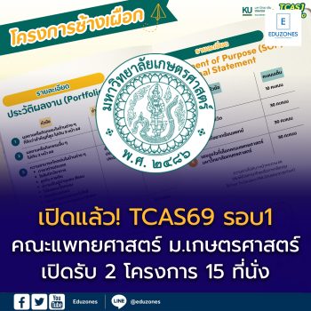 EZ Webmaster October 7, 2025 เปิดแล้ว! TCAS1/2569 (รอบ Portfolio) คณะแพทยศาสตร์ มหาวิทยาลัยเกษตรศาสตร์ EZ Webmaster October 7, 2025 💚 เปิดแล้ว! TCAS1/2569 (รอบ Portfolio) คณะแพทยศาสตร์ มหาวิทยาลัยเกษตรศาสตร์ 🌱 โอกาสดีสำหรับน้อง ๆ ที่ฝันอยากเป็น “แพทย์เกษตรศาสตร์” มาถึงแล้ว!คณะแพทยศาสตร์ มหาวิทยาลัยเกษตรศาสตร์ เปิดรับสมัครรอบ TCAS1 (Portfolio) ประจำปีการศึกษา 2569 📌 เปิดรับสมัครทั้งหมด 2 โครงการ 1️⃣ โครงการช้างเผือก — รับจำนวน 10 คน2️⃣ โครงการเรียนล่วงหน้าของ ม.เกษตรศาสตร์ —… Continue Reading