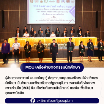 tui sakrapee October 24, 2023 สวนสุนันทา MOU เครือข่ายกิจกรรมนักศึกษา 9 สถาบัน tui sakrapee October 24, 2023 วันที่ 20 ตุลาคม 2566 มหาวิทยาลัยราชภัฏสวนสุนันทา โดยกองพัฒนานักศึกษา ลงนามบันทึกข้อตกลงความร่วมมือ (MOU) ร่วมกับเครือข่ายกิจกรรมนักศึกษา 9 สถาบัน เพื่อพัฒนาคุณภาพบัณฑิต โดยมี ผู้ช่วยศาสตราจารย์ ดร.เจตน์สฤษฎิ์ อังศุกาญจนกุล รองอธิการบดีฝ่ายกิจการนักศึกษาเป็นตัวแทนมหาวิทยาลัย พร้อมด้วยบุคลากรและองค์การนักศึกษาเข้าร่วมพิธีดังกล่าว ซึ่งจัดโดย สถาบันการบินพลเรือน ณ ห้องประชุมนานาชาติ สถาบันการบินพลเรือน Continue Reading
