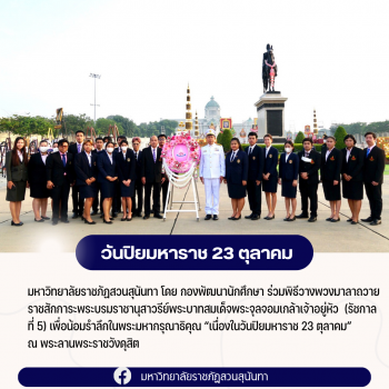 สวนสุนันทา ร่วมพิธีวางพวงมาลาถวายราชสักการะเนื่องในวันปิยมหาราช tui sakrapee October 24, 2023 วันที่ 23 ตุลาคม 2566 เวลา 07.00 น. มหาวิทยาลัยราชภัฏสวนสุนันทา โดย กองพัฒนานักศึกษา ร่วมพิธีวางพวงมาลาถวายราชสักการะพระบรมราชานุสาวรีย์พระบาทสมเด็จพระจุลจอมเกล้าเจ้าอยู่หัว (รัชกาลที่ 5) เพื่อน้อมรำลึกในพระมหากรุณาธิคุณ “เนื่องในวันปิยมหาราช 23 ตุลาคม” ณ พระลานพระราชวังดุสิต โดยมี ผู้ช่วยศาสตราจารย์ ดร.เจตสฤษฎิ์ อังศุกาญจนกุล รองอธิการบดีฝ่ายกิจการนักศึกษา พร้อมด้วย นายนิพนธ์ ชัยพฤกษทล ผู้อำนวยการกองพัฒนานักศึกษา หัวหน้าฝ่าย บุคลากรและองค์กรนักศึกษาในสังกัดเข้าร่วมพิธีดังกล่าวอย่างพร้อมเพรียงกัน Continue Reading