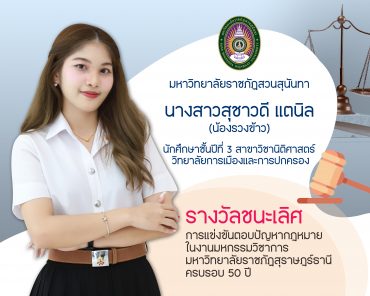 tui sakrapee October 12, 2023 “น้องรวงข้าว” นักศึกษานิติศาสตร์ สวนสุนันทา ชนะเลิศแข่งตอบปัญหากฎหมาย tui sakrapee October 12, 2023 มหาวิทยาลัยราชภัฏสวนสุนันทา ขอแสดงความยินดีกับ “นางสาวสุชาวดี แตนิล” น้องรวงข้าว นักศึกษาชั้นปีที่ 3 สาขาวิชานิติศาสตร์ วิทยาลัยการเมืองและการปกครอง ที่ได้คว้ารางวัลชนะเลิศ การแข่งขันตอบปัญหากฎหมาย ในงานมหกรรมวิชาการ มหาวิทยาลัยราชภัฏสุราษฎร์ธานี ครบรอบ 50 ปี มหกรรมวิชาการ โดย คณะนิติศาสตร์ มหาวิทยาลัยราชภัฏสุราษฎร์ธานี ดำเนินการจัดแข่งขันการตอบปัญหากฎหมาย (รอบชิงชนะเลิศ) ระดับมัธยมศึกษาตอนปลายและระดับอุดมศึกษา เนื่องในงานมหกรรมวิชาการ มหาวิทยาลัยราชภัฏสุราษฎร์ธานี ครบรอบ 50 ปี เพื่อเป็นการส่งเสริมให้นักเรียนและนักศึกษามีความรู้ความ เข้าใจหลักกฎหมายที่สำคัญ และสามารถนำไปปฏิบัติได้อย่างถูกต้อง Continue Reading