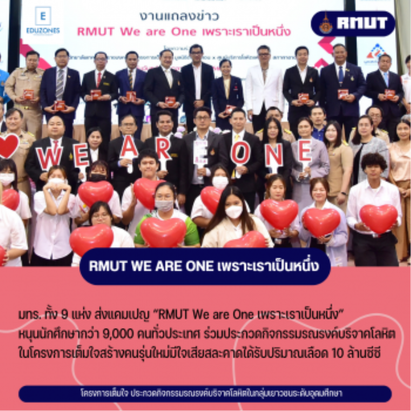 9 มทร. จัดกิจกรรมรณรงค์บริจาคเลือด ตั้งเป้า 10 ล้านซีซี ทั่วประเทศ tui sakrapee October 2, 2023 มทร. ทั้ง 9 แห่ง ส่งแคมเปญ “RMUT We are One เพราะเราเป็นหนึ่ง” หนุนนักศึกษากว่า 9,000 คนทั่วประเทศ ร่วมประกวดกิจกรรมรณรงค์บริจาคโลหิตในโครงการเต็มใจ สร้างคนรุ่นใหม่มีใจเสียสละคาดได้รับปริมาณเลือด 10 ล้านซีซี รศ.ดร.สมหมาย ผิวสอาด อธิการบดีมหาวิทยาลัยเทคโนโลยีราชมงคลธัญบุรี (มทร.ธัญบุรี) ในฐานะประธานที่ประชุมคณะกรรมการอธิการบดีมหาวิทยาลัยเทคโนโลยีราชมงคล (ทปอ.มทร.) พร้อมด้วยอธิการบดี และผู้แทนจาก 9 ราชมงคล จาก มทร.ธัญบุรี มทร.กรุงเทพ มทร.ตะวันออก มทร.พระนคร มทร.รัตนโกสินทร์ มทร.ล้านนา มทร.สุวรรณภูมิ มทร.อีสาน และมทร.ศรีวิชัย รวมถึงนายวรสรวง สมัตถพันธุ์ ประธานโครงการเต็มใจ นายณัฐวรรธน์ ภรนรา… Continue Reading