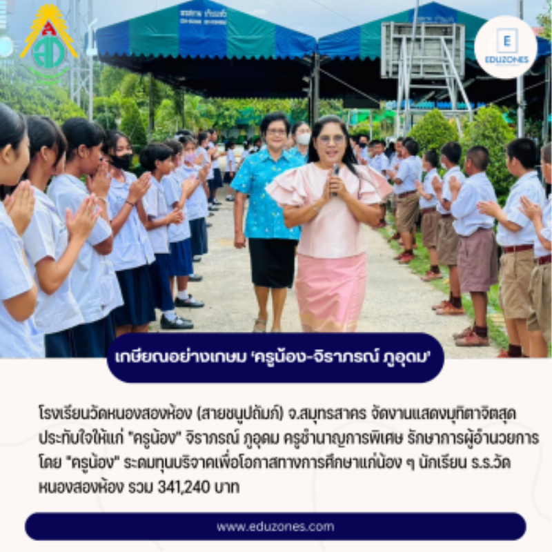 tui sakrapee October 1, 2023 เกษียณอย่างเกษม “ครูน้อง-จิราภรณ์ ภูอุดม” มอบทุนหนุนต่อยอดอนาคตดี ๆ ของเด็ก ๆ โรงเรียนวัดหนองสองห้อง สมุทรสาคร tui sakrapee October 1, 2023 30 กันยายน 2566 คุณครู รวมทั้งข้าราชการหลายท่าน ต้องถึงวาระวัยเกษียณอายุราชการกันหลายคน 1 ในนั้นคือ “ครูน้อง” จิราภรณ์ ภูอุดม ครูชำนาญการพิเศษ รักษาการผู้อำนวยการ โรงเรียนวัดหนองสองห้อง (สายชนูปถัมภ์) จ.สมุทรสาคร หลายโรงเรียน หลายหน่วยงานจัดงานเพื่อมุทิตาจิตให้กับผู้เกษียณอายุราชการ เฉกเช่นเดียวกันกับโรงเรียนวัดหนองสองห้อง (สายชนูปถัมภ์) จ.สมุทรสาคร ที่ท่านรักษาการผู้อำนวยการ ก็จัดเตรียมงานมาก่อนหน้านี้หลายเดือน จนสามารถระดมทุนยอดเงินบริจาค สู่ น้อง ๆ นักเรียน ร.ร.วัดหนองสองห้อง จำนวนยอดบริจาค รวม 341,240… Continue Reading