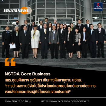 กมธ.อุดมศึกษาฯ ศึกษาดูงาน สวทช. “การนำผลงานวิจัยไปใช้ประโยชน์และตอบโจทย์ความต้องการของสังคมและเศรษฐกิจโดยรวมของประเทศ” tui sakrapee September 28, 2023 กมธ.อุดมศึกษาฯ เดินทางศึกษาดูงาน “การนำผลงานวิจัยไปใช้ประโยชน์และตอบโจทย์ความต้องการของสังคมและเศรษฐกิจโดยรวมของประเทศ” ณ สำนักงานพัฒนาวิทยาศาสตร์และเทคโนโลยีแห่งชาติ (สวทช.) จังหวัดปทุมธานี เมื่อวันที่ 27 กันยายน 2566 เวลา 13.30 นาฬิกา ณ สำนักงานพัฒนาวิทยาศาสตร์และเทคโนโลยีแห่งชาติ (สวทช.) จังหวัดปทุมธานี คณะกรรมาธิการการอุดมศึกษา วิทยาศาสตร์ วิจัยและนวัตกรรม วุฒิสภา ลงพื้นที่ตรวจเยี่ยมการดำเนินงานของสำนักงานพัฒนาวิทยาศาสตร์และเทคโนโลยีแห่งชาติ (สวทช.) จังหวัดปทุมธานี นำโดย ศาสตราจารย์เกียรติคุณไกรสิทธิ์ ตันติศิรินทร์ รองประธานคณะกรรมาธิการ คนที่ 3 พร้อมด้วยกรรมาธิการและคณะ เข้าร่วมการเดินทาง โดยมี ศาสตราจารย์ ดร.ชูกิจ ลิมปิจำนงค์ ผู้อำนวยการสำนักงานพัฒนาวิทยาศาสตร์และเทคโนโลยีแห่งชาติ (สวทช.) ให้การต้อนรับ จากนั้น ได้รับฟังการบรรยายสรุปภาพรวมผลการดำเนินภายใต้นโยบาย… Continue Reading