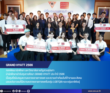 นักศึกษาสวนสุนันทา รับทุน GRAND HYATT สนับสนุนความหลากหลายทางเพศ ประจำปี 2566 tui sakrapee September 26, 2023 เมื่อวันที่ 25 กันยายน 2566 ฝ่ายทุนการศึกษา กองพัฒนานักศึกษา มหาวิทยาลัยราชภัฏสวนสุนันทา นำนักศึกษาประกอบด้วย นายวรปรัชญ์ กีรติวิทยาภรณ์ สาขาวิชาการออกแบบแฟชั่นและสินค้าไลฟ์สไตล์ (การออกแบบแฟชั่น)คณะศิลปกรรมศาสตร์ นายชัยวัฒน์ จรูญรัตน์ สาขาวิชาภาษาอังกฤษ คณะมนุษยศาสตร์และสังคมศาสตร์ นายโชคชัย ผาสุข สาขาวิชาธุรกิจระหว่างประเทศ คณะวิทยาการจัดการบริหารธุรกิจ นายวัชราวุฒิ แตงรอด สาขาวิชาศิลปะการแสดง (นาฏศิลป์ไทย) คณะศิลปกรรมศาสตร์ และนายพิพัฒนะพงษ์ ธีรากิจ สาขาวิชาบริหารธุรกิจ (การตลาด) คณะวิทยาการจัดการ เข้ารับทุนการศึกษา GRAND HYATT ประจำปี 2566 ณ ห้องประชุมชั้น 6 อาคารสมเด็จอุปถัมภ์ สมาคมวางแผนครอบครัวแห่งประเทศไทย ในพระราชูปถัมภ์สมเด็จพระศรีนครินทราบรมราชชนนี GRAND… Continue Reading