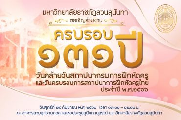 สวนสุนันทา เชิญร่วมงาน “วันครบรอบการสถาปนาการฝึกหัดครูไทย ครบรอบ 131 ปี และวันคล้ายวันสถาปนากรมการฝึกหัดครู” tui sakrapee September 25, 2023 มหาวิทยาลัยราชภัฏสวนสุนันทา ขอเชิญร่วมงาน “วันครบรอบการสถาปนาการฝึกหัดครูไทย ครบรอบ 131 ปี และวันคล้ายวันสถาปนากรมการฝึกหัดครู” ในวันศุกร์ที่ 29 เกันยายน 2566 เวลา 07.00 – 12.00 น. ณ อาคารสายสุทธานภดล และหอประชุมสุนันทานุสรณ์ มหาวิทยาลัยราชภัฏสวนสุนันทา Continue Reading