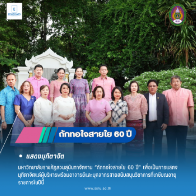 tui sakrapee September 22, 2023 สวนสุนันทาจัดงาน “ถักทอใจสายใย 60 ปี” แสดงมุทิตาจิตแด่ผู้บริหารพร้อมอาจารย์และบุคลากรผู้เกษียณอายุราชการ tui sakrapee September 22, 2023 มหาวิทยาลัยราชภัฏสวนสุนันทาจัดงาน “ถักทอใจสายใย 60 ปี” เพื่อเป็นการแสดงมุทิตาจิตแด่ ผู้ช่วยศาสตราจารย์ ดร.ปรีชา พงษ์เพ็ง รองอธิการบดีฝ่ายบริหาร พร้อมอาจารย์และบุคลากรสายสนับสนุนวิชาการผู้เกษียณอายุราชการในปีนี้ โดยมี รองศาสตราจารย์ ดร.ชุติกาญจน์ ศรีวิบูลย์ อธิการบดีมหาวิทยาลัยราชภัฏสวนสุนันทา เป็นประธานในพิธี เมื่อวันที่ 22 กันยายน 2566 ในงานพิธีครั้งนี้มีผู้บริหาร คณาจารย์รวมทั้งบุคลากรเข้าร่วมงานกันอย่างคึกคักท่ามกลางบรรยากาศที่สุดประทับใจในมิตรภาพที่มอบให้แก่กัน จากนั้นได้มีพิธีสักการะสมเด็จพระนางเจ้าสุนันทากุมารีรัตน์ พระบรมราชเทวี ณ ลานพระราชานุสาวรีย์ สมเด็จพระนางเจ้าสุนันทากุมารีรัตน์ฯ มหาวิทยาลัยราชภัฏสวนสุนันทา . . . นวรัตน์… Continue Reading
