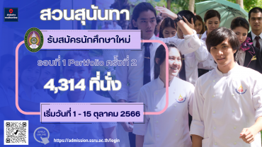 สวนสุนันทา รับตรงครั้งใหญ่ รอบPortfolio เริ่ม 1 ต.ค.นี้ 4,314 ที่นั่ง tui sakrapee September 19, 2023 มหาวิทยาลัยราชภัฏสวนสุนันทา เปิดรับสมัครบุคคลเข้าศึกษาในมหาวิทยาลัย ราชภัฏสวนสุนันทาภาคปกติ ระดับปริญญาตรี ประจำปีการศึกษา 2567 (รอบที่ 1 Portfolio) รับตรง ครั้งที่2 จำนวนรับนักศึกษา คณะวิทยาศาสตร์และเทคโนโลยี จำนวนรับ (คน) 582 คณะเทคโนโลยีอุตสาหกรรม จำนวนรับ (คน) 280 คณะมนุษยศาสตร์และสังคมศาสตร์ จำนวนรับ (คน) 456 คณะศิลปกรรมศาสตร์ จำนวนรับ (คน) 312 คณะวิทยาการจัดการ จำนวนรับ (คน) 544 วิทยาลัยนวัตกรรมและการจัดการ จำนวนรับ (คน) 152 วิทยาลัยสถาปัตยกรรมศาสตร์ จำนวนรับ (คน) 64 วิทยาลัยสหเวชศาสตร์วิทยาเขตสมุทรสงคราม จำนวนรับ… Continue Reading