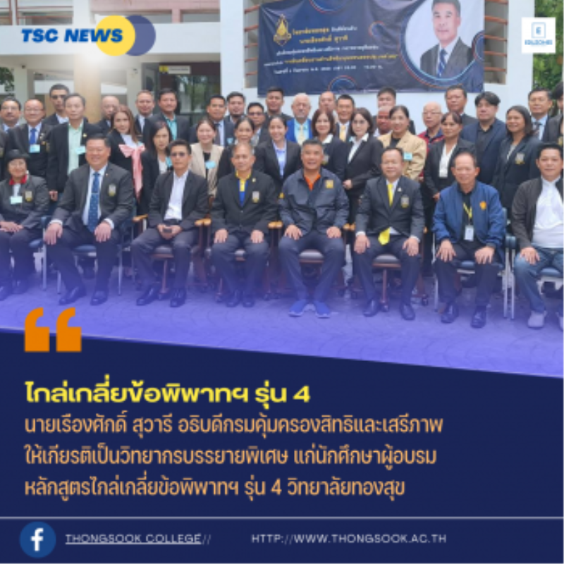 อธิบดีกรมคุ้มครองสิทธิและเสรีภาพ ให้เกียรติเป็นวิทยากรบรรยายพิเศษให้นักศึกษาผู้อบรมหลักสูตรไกล่เกลี่ยข้อพิพาทฯ รุ่น 4 วิทยาลัยทองสุข tui sakrapee September 9, 2023 นายเรืองศักดิ์ สุวารี อธิบดีกรมคุ้มครองสิทธิและเสรีภาพ ให้เกียรติเป็นวิทยากรบรรยายพิเศษให้นักศึกษาผู้อบรมหลักสูตรไกล่เกลี่ยข้อพิพาทฯ รุ่น 4 วิทยาลัยทองสุข ในวันที่ 9 กันยายน 2566 ช่วง 09.00-10.00 น. ที่ห้อง 109 อาคารทองสุข วิทยาลัยทองสุข การอบรมหลักสูตรอบรมการไกล่เกลี่ยข้อพิพาทตามพระราชบัญญัติการไกล่เกลี่ยข้อพิพาท พ.ศ. 2562 จัดขึ้นเพื่อเสริมสร้างความรู้ ความเข้าใจในทฤษฎี แนวคิด และแนวปฏิบัติเกี่ยวกับผู้ที่ประสงค์จะเป็นผู้ไกล่เกลี่ยข้อพิพาท ตามพระราชบัญญัติการไกล่เกลี่ย ซึ่งผู้ที่ผ่านการอบรมหลักสูตรนี้ ถือเป็นกลไกที่สำคัญอย่างยิ่งที่จะขับเคลื่อนการดำเนินงานและเข้ามามีส่วนร่วมกับกระทรวงยุติธรรม ในการส่งเสริม สนับสนุน และดำเนินการไกล่เกลี่ยข้อพิพาทในฐานะผู้ไกล่เกลี่ย เพื่อให้ประชาชนทุกชนชั้นสามารถเข้าถึงกระบวนการยุติธรรมได้อย่างแท้จริง ทำให้ปริมาณคดีขึ้นสู่ศาลลดน้อยลง ลดปัญหาความขัดแย้ง เกิดความสมานฉันท์ขึ้นในสังคม วิทยาลัยทองสุข ได้จัดการอบรมหลักสูตรอบรมการไกล่เกลี่ยข้อพิพาทฯ เป็นรุ่นที่ 4 แล้ว โดยเปิดรับสมัครบุคคลทั่วไปที่สนใจเข้ารับการอบรม ซึ่งคณะกรรมการพัฒนาการบริหารงานยุติธรรมแห่งชาติ… Continue Reading