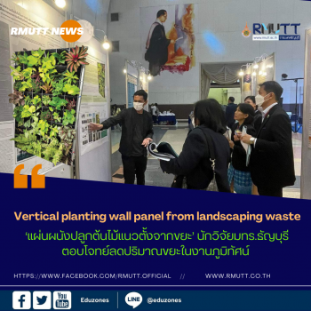 tui sakrapee September 4, 2023 ‘แผ่นผนังปลูกต้นไม้แนวตั้งจากขยะ’ นักวิจัยมทร.ธัญบุรี ตอบโจทย์ลดปริมาณขยะในงานภูมิทัศน์ tui sakrapee September 4, 2023 “แผ่นผนังปลูกต้นไม้แนวตั้งจากขยะ ในงานภูมิทัศน์” Vertical planting wall panel from landscaping waste ผลงานของอาจารย์ดนุพล มากผ่อง และผู้ช่วยศาสตราจารย์วีระยุทธ นาคทิพย์ นักวิจัยและอาจารย์ สาขาเทคโนโลยีภูมิทัศน์ คณะเทคโนโลยีการเกษตร มหาวิทยาลัยเทคโนโลยีราชมงคลธัญบุรี ตอบโจทย์กระทรวงการอุดมศึกษา วิทยาศาสตร์ วิจัยและนวัตกรรม ที่ขับเคลื่อน BCG Model เพื่อการพัฒนาที่ยั่งยืน นำขยะกลับไปใช้ใหม่ให้เกิดประโยชน์ และยังได้รับรางวัล Special Prize ด้านมนุษศาสตร์และสังคมศาสตร์ โดยผู้ช่วยศาสตราจารย์ ดร.กรณ์รวี เอี่ยมสมบูรณ์… Continue Reading