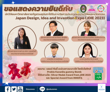 “ผลงาน บอมบ์ กัมมี่ มะม่วงหาวมะนาวโห่ โพรไบโอติกส์” ทีมนักวิจัย – นักศึกษาสวนสุนันทา คว้าเหรียญเงินจากญี่ปุ่น tui sakrapee August 21, 2023 ทีมนักวิจัย – นักศึกษาสวนสุนันทา สร้างชื่อคว้ารางวัลเหรียญเงิน “ผลงาน บอมบ์ กัมมี่ มะม่วงหาวมะนาวโห่ โพรไบโอติกส์” นักวิจัยและนักศึกษาคณะวิทยาศาสตร์และเทคโนโลยี มหาวิทยาลัยราชภัฏสวนสุนันทา ได้แก่ ผู้ช่วยศาสตราจารย์ ดร.วนิดา วอนสวัสดิ์ ผู้ช่วยศาสตราจารย์ ดร.วัฒนา พันธุ์พืช ผู้ช่วยศาสตราจารย์ ดร.กานต์ชนา สิทธิ์เหล่าถาวร นายภคิน ถาวรธนิตกุล นางสาวณภัทร ปิยะศาสตร์ คว้ารางวัลเหรียญเงินและรางวัลพิเศษ (Special Award from INNOPA) จากผลงาน “บอมบ์ กัมมี่ มะม่วงหาวมะนาวโห่ โพรไบโอติกส์ : Probio KaranDa gummy Bomb” ในงาน “2023… Continue Reading