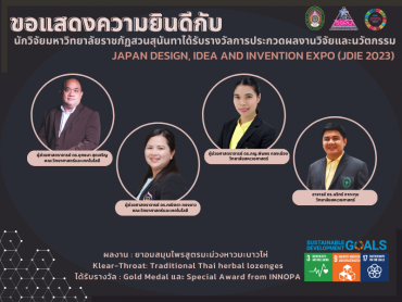 ยาอมสมุนไพรสูตรมะม่วงหาวมะนาวโห่ ทีมนักวิจัยสวนสุนันทาคว้ารางวัลเหรีญทองเวทีนานาชาติ tui sakrapee July 17, 2023 ทีมนักวิจัยสวนสุนันทาคว้ารางวัลเหรีญทองเวทีระดับนานาชาติ จากผลงานยาอมสมุนไพรสูตรมะม่วงหาวมะนาวโห่ นักวิจัยมหาวิทยาลัยราชภัฏสวนสุนันทา โดย ผู้ช่วยศาสตราจารย์ ดร.ยุทธนา สุดเจริญ และ ผู้ช่วยศาสตราจารย์ ดร.คณิตดา ทองขาว คณะวิทยาศาสตร์และเทคโนโลยี ผู้ช่วยศาสตราจารย์ ดร.ภญ.พิมพร ทองเมือง และ อาจารย์ ดร.นริทร์ กากะทุม วิทยาลัยสหเวชศาสตร์ นำผลงานวิจัย “ยาอมสมุนไพรสูตรมะม่วงหาวมะนาวโห่” ซึ่งได้รับการคัดเลือกจากสำนักงานการวิจัยแห่งชาติ (วช.) เข้าร่วมประกวดและจัดแสดงผลงาน เมื่อวันที่ 8 กรกฎาคม 2566 ณ Tokyo Ariake Garden Convention Center, Japan กรุงโตเกียว ประเทศญี่ปุ่น ผลงานปรากฏว่าทีมนักวิจัยของมหาวิทยาลัยราชภัฏสวนสุนันทาสามารถคว้ารางวัลเหรียญทองและรางวัลพิเศษ (Special Award from… Continue Reading