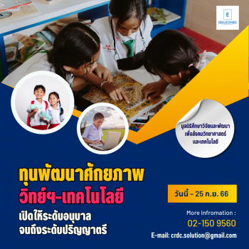 ทุนพัฒนาศักยภาพด้านวิทย์ฯ-เทคโนโลยี เปิดให้ระดับอนุบาลจนถึงระดับปริญญาตรี tui sakrapee June 23, 2023 มูลนิธิศึกษาวิจัยและพัฒนาเพื่อสังคมวิทยาศาสตร์และเทคโนโลยี ได้จัดทำโครงการมอบทุนการศึกษาของมูลนิธิศึกษาวิจัยและพัฒนาเพื่อสังคมวิทยาศาสตร์และเทคโนโลยี ซึ่งเป็นโครงการที่ให้การสนับสนุนและส่งเสริมศักยภาพด้านการศึกษา แก่เยาวชนที่มีความสามารถ มีความตั้งใจ และมีความประพฤติดี มีการใช้เวลาว่างให้เป็นประโยชน์ เพื่อสร้างโอกาสความสำเร็จทางด้านการศึกษา ทางมูลนิธิฯ มีความตั้งใจส่งเสริมให้เยาวชนที่มีความมุ่งมั่นที่จะศึกษาต่อ สร้างโอกาสและความมุ่งมั่นทางด้านการศึกษา ทั้งการปลูกฝังค่านิยมให้เยาวชนรักและเห็นคุณค่า ทั้งยังตระหนักถึงความสำคัญของการศึกษา สนับสนุนเยาวชนที่มีความตั้งใจเรียน มีความสามารถ ตลอดจนเพื่อส่งเสริมตอบแทนและช่วยเหลือสังคม ทางมูลนิธิฯ จึงได้จัดทำโครงการกล่าวขึ้น เปิดรับสมัครรอบที่ 2 วันนี้ – 25 กันยายน 2566 และประกาศผลภายใน 31 ธันวาคม 2566 ทุนการศึกษามูลนิธิศึกษาวิจัยและพัฒนาเพื่อสังคมวิทยาศาสตร์และเทคโนโลยี เป็นทุนการศึกษาในระดับ อนุบาลศึกษา ประถมศึกษา มัธยมศึกษา อาชีวศึกษา และอุดมศึกษา(เฉพาะระดับปริญญาตรี)ซึ่งศึกษาอยู่ภายในประเทศไทย ระดับทุนการศึกษาที่สนับสนุน (เฉพาะสถานศึกษาภายในประเทศไทย) – ระดับประถมศึกษา – ระดับมัธยมศึกษา… Continue Reading
