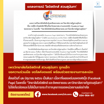 เพจวิทยาลัยโลจิสติกส์ สวนสุนันทา ถูกแฮ็กเผยแพร่เนื้อหาไม่เหมาะสม ขอความร่วมมืองดไลค์งดแชร์ พร้อมช่วยรายงานการละเมิด tui sakrapee June 19, 2023 แถลงการณ์วิทยาลัยโลจิสติกส์และซัพพลายเชน มหาวิทยาลัยราชภัฏสวนสุนันทา เรื่อง กรณีมีการโพสต์คลิปวิดีโอเนื้อหาไม่เหมาะสมผ่านเพจเฟซบุ๊ก (Facebook Page) ของหน่วยงาน ในเพจชื่อ “วิทยาลัยโลจิสติกส์และซัพพลายเชน มหาวิทยาลัยราชภัฏสวนสุนันทา ตามที่ปรากฏในเพจเฟซบุ๊ก (Facebook Page) ของหน่วยงาน “วิทยาลัยโลจิสติกส์และซัพพลายเชน มหาวิทยาลัยราชภัฏสวนสุนันทา” ตามลิงก์ www.facebook.com/WLJT2021 กรณีมีการโพสต์คลิปวิดีโอที่มีเนื้อหา ที่ไม่เหมาะสมนั้น เนื่องจากถูกอาชญากรรมทางออนไลน์ (Hacker) ยึดครองบัญชีโดยบุคคลที่ไม่ทราบสถานะ และกระทําการลบผู้ดูแลเพจ (Admin) ออกจากบัญชีทั้งหมด ทําให้ไม่สามารถดําเนินการอย่างใดกับบัญชีเพจดังกล่าวได้ ทั้งยังเผยแพร่สื่อที่มีเนื้อหาไม่เหมาะสม ส่งผลให้ภาพลักษณ์และชื่อเสียงของหน่วยงานเสียหายเป็นอย่างมาก วิทยาลัยโลจิสติกส์และซัพพลายเชน มหาวิทยาลัยราชภัฏสวนสุนันทา จึงขอใช้โอกาสนี้ชี้แจงว่า ตั้งแต่วันที่ ๑๒ มิถุนายน ๒๕๖๖ เป็นต้นมา เนื้อหาที่เผยแพร่บนเพจเฟซบุ๊ก (Facebook Page) ในเพจชื่อ “วิทยาลัยโลจิสติกส์… Continue Reading