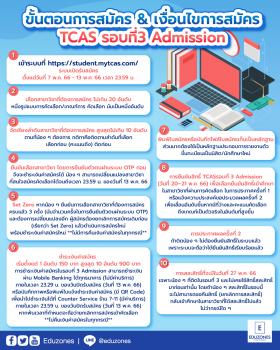 ขั้นตอนการสมัคร & เงื่อนไขการสมัคร TCAS รอบที่3 Admission EZ Webmaster May 6, 2023 ก่อนที่น้อง ๆ จะทำการสมัคร TCASรอบที่3 ในวันพรุ่งนี้พี่แฮนด์ขอมาทบทวนขั้นตอนการสมัครและเงื่อนไขในการสมัครให้น้อง ๆ ได้ทำความเข้าใจกันอีกครั้ง 1.เข้าระบบที่ https://student.mytcas.com/ ระบบเปิดรับสมัครตั้งแต่วันที่ 7 พ.ค. 66 – 13 พ.ค. 66 เวลา 23.59 น. . 2.เลือกสาขาวิชาที่ต้องการสมัคร ไม่เกิน 20 อันดับ หนึ่งรูปแบบการคัดเลือก/เกณฑ์การ คัดเลือก นับเป็นหนึ่งอันดับ บางสาขาวิชาอาจมีรูปแบบการคัดเลือก หรือ เกณฑ์การคัดเลือก มากกว่า 1 รูปแบบ/เกณฑ์ น้อง ๆ สามารถเลือกสมัครเพียงรูปแบบใดรูปแบบหนึ่ง หรือเลือกสมัครทุกรูปแบบได้ โดยแต่ละรูปแบบ/เกณฑ์การคัดเลือกถือเป็นคนละอันดับ ขอให้น้อง ๆ ไปศึกษาเงื่อนไขการเลือกรูปแบบ/เกณฑ์การคัดเลือกในการสมัครจากประกาศการรับสมัครของสถาบันอุดมศึกษานั้น… Continue Reading