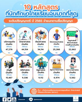 10 หลักสูตรที่มีนักศึกษาไทยจบการศึกษามากที่สุด !! ระดับปริญญาตรี 2565 EZ Webmaster April 22, 2023 อว.เผยข้อมูลจำนวนผู้สำเร็จการศึกษา ปี 2565 รวมทั้งสิ้น 292,935 คน หลักสูตรระดับปริญญาตรี “บริหารธุรกิจ” ครองแชมป์ มีผู้จบกว่า 47,000 คน โดยหลักสูตร “วิทยาศาสตร์” ตามมาติด ๆ มีผู้จบจบกว่า 44,000 คน ส่วนสายสุขภาพ ยังห่างไกล “แพทยศาสตร์” จบแค่ 2,614 คน “หมอฟัน” น้อยนิดจบแค่ 759 คน เท่านั้น กองระบบและบริหารข้อมูลเชิงยุทธศาสตร์การอุดมศึกษา วิทยาศาสตร์ วิจัยและนวัตกรรม (กรข.) กลุ่มพัฒนาและบริหารจัดการข้อมูลเชิงยุทธศาสตร์ (พข.) สำนักงานปลัดกระทรวงการอุดมศึกษา วิทยาศาสตร์ วิจัยและนวัตกรรม (สป.อว.) เปิดเผยจำนวนผู้สำเร็จการศึกษา ปี… Continue Reading