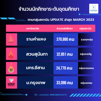 อว.เผยข้อมูลนักศึกษารวมล่าสุด ถึงมีนาคม 2566 มีทั้งสิ้น 1,752,554 คน “รามคำแหง” จำนวนมากสุดกว่า 3.7 แสนคน tui sakrapee March 31, 2023 สำนักงานปลัดกระทรวงการอุดมศึกษา วิทยาศาสตร์ วิจัยและนวัตกรรม เผยข้อมูลจำนวนนักศึกษารวม ปีการศึกษา 2565 ภาคเรียนที่ 1 ใน สถาบันอุดมศึกษาทั้งหมด จำแนกตาม สถาบัน / กลุ่มสถาบัน วันที่จัดทำรายงาน 13 มีนาคม 2566 มีจำนวนนักศึกษารวมทั้งสิ้น 1,752,554 คน จำนวนนักศึกษารวม ปีการศึกษา 2565 ภาคการศึกษาที่ 1 ทั้งสิ้น 1,752,554 คน เป็นนักศึกษาในสถาบันอุดมศึกษาของรัฐ 1,437,840 คน เป็นนักศึกษาในสถาบันอุดมศึกษาของเอกชน 281,128 คน สถานศึกษานอกสังกัดกระทรวงอว. 33,586 คน โดยรวมตั้งแต่ระดับการศึกษา ปวช. ปวส. อนุปริญญา… Continue Reading
