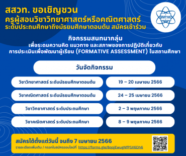 EZ Webmaster March 24, 2023 สสวท. ชวนครูวิทย์ – คณิตระดมความคิดออนไลน์ แนวทางและการปฏิบัติเกี่ยวกับการประเมินเพื่อพัฒนาผู้เรียนในสถานศึกษา EZ Webmaster March 24, 2023 สถาบันส่งเสริมการสอนวิทยาศาสตร์และเทคโนโลยี (สสวท.) ขอเชิญครูผู้สอนวิทยาศาสตร์หรือคณิตศาสตร์ประถมศึกษาถึงมัธยมศึกษาตอนต้น สมัครเข้าร่วมกิจกรรมสนทนากลุ่มเพื่อระดมความคิด แนวทาง และสภาพของการปฏิบัติเกี่ยวกับการประเมินเพื่อพัฒนาผู้เรียน (FOMATIVE ASSESSMENT) ในสถานศึกษา วิชาวิทยาศาสตร์ระดับมัธยมศึกษาตอนต้น วันที่ 19 – 20 เมษายน 2566 วิชาคณิตศาสตร์ระดับมัธยมศึกษาตอนต้น วันที่ 24 – 25 เมษายน 2566 วิชาวิทยาศาสตร์ระดับประถมศึกษา วันที่ 2 – 3 พฤษภาคม 2566 วิชาคณิตศาสตร์ระดับประถมศึกษา วันที่ 8 – 9 พฤษภาคม 2566 สมัครได้ตั้งแต่บัดนี้ถึงวันที่ 7 เมษายน 2566 คลิกสมัครออนไลน์ที่ https://forms.gle/8qqjEwugNfPSX6Dh6 สอบถามข้อมูลเพิ่มเติมได้ที่อีเมล ea@ipst.ac.th Continue Reading