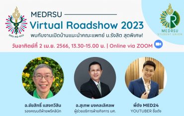 EZ Webmaster March 23, 2023 สโมสรนศ.แพทย์ ม.รังสิต จัดกิจกรรมเปิดบ้านแนะนำ ว.แพทย์ MEDRSU Virtual Roadshow EZ Webmaster March 23, 2023 คณะกรรมการสโมสรนักศึกษา วิทยาลัยแพทยศาสตร์ มหาวิทยาลัยรังสิต จัดกิจกรรมเปิดบ้านแนะนำวิทยาลัยแพทยศาสตร์ MEDRSU Virtual Roadshow ในวันอาทิตย์ที่ 2 เมษายน 2566 เวลา 13.30-15.00 น. ผ่านทาง Online via ZOOM พบกับการแนะนำวิทยาลัยแพทยศาสตร์ มหาวิทยาลัยรังสิต อาทิ หลักสูตรการเรียนการสอน การใช้ชีวิต กิจกรรม แชร์ประสบการณ์จากรุ่นพี่นักศึกษาแพทย์และศิษย์เก่า แชร์เทคนิคและรายละเอียดการสอบเข้า และอื่นๆ อีกมากมาย ทั้งนี้ คณะกรรมการผู้จัดงานจะทำการส่ง link ZOOM ให้เข้ากับผู้เข้าร่วมผ่านช่องทาง E-mail ในเช้าของวันงาน สำหรับผู้ที่สนใจสามารถลงทะเบียนได้ที่… Continue Reading