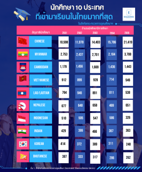 เปิดสถิตินักศึกษา 10 ประเทศ ที่นิยมเรียนต่ออุดมศึกษาไทย 5 ปีล่าสุด เด็กจีนครองแชมป์ “เมียนมาร์” ควง “กัมพูชา” ตามมาห่าง ๆ tui sakrapee March 17, 2023 สำนักงานปลัดกระทรวงการอุดมศึกษา วิทยาศาสตร์ วิจัยและนวัตกรรม (สป.อว.) เปิดข้อมูลจำนวนนักศึกษารวมล่าสุดเดือนมีนาคม พ.ศ.2566 โดยเป็นจำนวนนักศึกษารวม ตั้งแต่ปีการศึกษา 2561-2565 ภาคเรียนที่ 1 ในสถาบันอุดมศึกษาทั้งหมด จำแนกตาม (นักศึกษาต่างชาติ รัฐ และเอกชน ในสังกัดอว. ปีการศึกษา 2561- 2565 จำแนกตาม ชื่อสัญชาติของนักศึกษา ) นักศึกษาจากสาธารณรัฐประชาชนจีน เข้ามาเรียนมากที่สุด จากข้อมูลล่าสุด ปรากฏว่านักศึกษาจากสาธารณรัฐประชาชนจีน นิยมเข้ามาเรียนในสถาบันอุดมศึกษาของไทยมากที่สุด โดยจำนวนรวมล่าสุดปี 2565 มีทั้งสิ้น 21,419 คน อันดับ 2 เป็นนักศึกษาจากประเทศเมียนมาร์ มีจำนวนรวม 3,708 คน และอันดับ 3 เป็นนักศึกษาจากประเทศกัมพูชา… Continue Reading