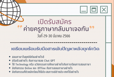 ว.ศิลปศาสตร์ ม.รังสิต จัดกิจกรรม “ค่ายครูภาษากลับมาเจอกัน” EZ Webmaster March 15, 2023 วิทยาลัยศิลปศาสตร์ มหาวิทยาลัยรังสิต จัดกิจกรรม “ค่ายครูภาษากลับมาเจอกัน” เชิญชวนอาจารย์ และคุณครูที่สอนภาษาเข้าร่วมกิจกรรม โดยมีรายละเอียดดังนี้ ค่ายครูภาษากลับมาเจอกัน จัดขึ้นระหว่างวันที่ 29-30 มีนาคม 2566 รับสมัครจำนวน 35 คน จัดขึ้นที่มหาวิทยาลัยรังสิต และภูมนตรารีสอร์ท โดยมีค่าใช้จ่ายสำหรับการสมัคร 1,000 บาท (รวมค่าอาหาร-อาหารว่าง ค่าเดินทางไป-กลับมหาวิทยาลัยรังสิต และภูมนตรารีสอร์ท จังหวัดนครนายก และค่าที่พัก 1 คืน) ชำระค่าใช้จ่ายได้ที่บัญชี: ศูนย์การแปลและบริการทางภาษา ม.รังสิต เลขที่ 020-0-14867-4 ธนาคารกรุงเทพ และแนบหลักฐานการโอนพร้อมกันกับการกรอกใบสมัคร เสวนา “การสอนภาษาในยุคดิจิทัล” (ไม่มีค่าใช้จ่าย) จัดขึ้นในวันพุธที่ 29 มีนาคม 2566 เวลา… Continue Reading