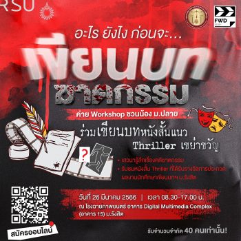 EZ Webmaster March 9, 2023 ม.รังสิต ชวนน้อง ม.ปลาย ร่วมค่าย Workshop Workshop “อะไร ยังไง ก่อนจะ… (เขียนบท) ฆาตกรรม” (ฟรี!) EZ Webmaster March 9, 2023 สาขาวิชาการเขียนบทและการกำกับภาพยนตร์และโทรทัศน์ วิทยาลัยนิเทศศาสตร์ เเละคณะอาชญาวิทยาและการบริหารงานยุติธรรม มหาวิทยาลัยรังสิต เชิญชวนน้อง ๆ มัธยามศึกษาตอนปลาย ร่วมกิจกรรม Workshop “อะไร ยังไง ก่อนจะ… (เขียนบท) ฆาตกรรม” ในวันที่ 26 มีนาคม 2566 เวลา 08.30-17.00 น. ณ โรงฉายภาพยนตร์ อาคาร Digital Multimedia Complex (อาคาร 15) ม.รังสิต รับจำนวนจำกัด เพียง 40 ที่นั่งเท่านั้น… Continue Reading