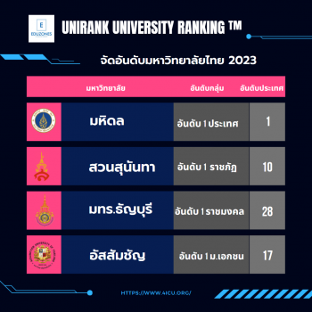 Unirank 2023 จัดมหา’ลัยยอดนิยม “มหิดล” ครองที่ 1ประเทศ “สวนสุนันทา” เป็น 1 ราชภัฏ “มทร.ธัญบุรี” ยึดที่ 1 กลุ่มราชมงคล ”เอแบค” ยังรั้งที่ 1 กลุ่มเอกชน tui sakrapee March 9, 2023 เว็บไซต์จัดอันดับสถาบันการศึกษา 4Icu หรือ “Unirank” ซึ่งได้รับการยอมรับจากประเทศต่าง ๆ ถึง 200 ประเทศ และสถาบันการศึกษาอีกกว่า 14,000 แห่ง ประกาศการจัดอันดับมหาวิทยาลัยยอดนิยมในประเทศไทย ในครึ่งปีแรก 2023 “Unirank” Top Universities in Thailand 2023 Thai University Ranking โดยในปี 2023 นี้มี 123 สถาบันอุดมศึกษาของไทยที่เข้าเกณฑ์การคัดเลือก uniRank ผลการจัดอันดับปรากฏว่า อันดับครึ่งปีแรก มหาวิทยาลัยมหิดล ยังครองที่ 1 ของประเทศไทย โดยมีอันดับ 2 คือจุฬาฯ และ ม.เชียงใหม่ … Continue Reading