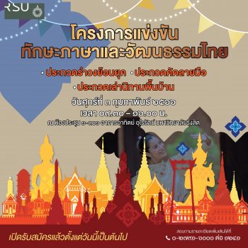 EZ Webmaster January 27, 2023 ม.รังสิต จัดโครงการแข่งขันทักษะภาษาและวัฒนธรรมไทย 2565 EZ Webmaster January 27, 2023 สาขาวิชาภาษาไทยเพื่อการสื่อสาร วิทยาลัยศิลปศาสตร์ มหาวิทยาลัยรังสิต โครงการแข่งขันทักษะภาษาและวัฒนธรรมไทย 2565 ในวันศุกร์ที่ 3 กุมภาพันธ์ 2565 เวลา 09.30 – 16.00 น. ณ ห้องประชุม 1-301 อาคารอาทิตย์ อุไรรัตน์ (อาคาร 1) มหาวิทยาลัยรังสิต ภายในงานพบกับการประกวดและการแข่งขัน อาทิ การประกวดคัดลายมือ การประกวดรำวงย้อนยุค การประกวดเล่านิทานพื้นบ้าน ในปีนี้เปิดรับผู้เข้าร่วมการแข่งขันทั้งนักศึกษาไทย และนักศึกษาต่างชาติสำหรับผู้ที่สนใจเข้าร่วมการประกวดสามารถดูรายละเอียดเพิ่มเติมได้จาก QR CODE สำหรับผู้ที่สนใจสามารถสอบถามรายละเอียดเพิ่มเติมได้ที่… Continue Reading