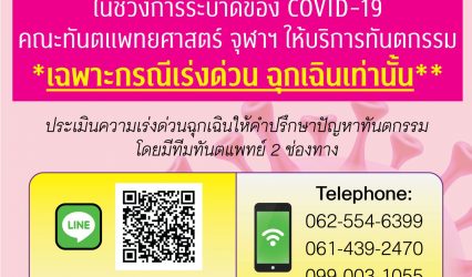 Blogกิจกรรม บริการ “สายตรง ฟ ฟัน” คณะทันตแพทยศาสตร์ จุฬาฯ ให้คำปรึกษาปัญหาทางทันตกรรม ในช่วงการระบาดของ COVID-19 tui sakrapee January 7, 2021 คณะทันตแพทยศาสตร์ จุฬาฯ เปิดให้บริการ “สายตรง ฟ ฟัน กับทันตะ จุฬาฯ” ในช่วงการระบาดของ COVID-19 เพื่อประเมินความเร่งด่วนฉุกเฉิน ให้คำแนะนำปรึกษาปัญหาทางทันตกรรม ผ่านสองช่องทางคือ Line :…
