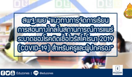 ครู-อาจารย์ สพฐ.เผย “แนวทางการจัดการเรียนการสอนทางไกลในสถานการณ์การแพร่ระบาดของโรคติดเชื้อไวรัสโคโรนา 2019 (COVID-19) สําหรับครูและผู้ปกครอง” EZ Webmaster January 5, 2021 เมื่อวันที่ 5 มกราคม 2564 ที่ผ่านมา ทางสำนักงานคณะกรรมการการศึกษาขั้นพื้นฐาน ได้ส่งเอกสารถึงผู้อำนวยการสำนักงานเขตพื้นที่การศึกษาประถมศึกษาและมัธยมศึกษาทุกเขต เรื่อง แนวทางการจัดการเรียนการสอนทางไกล ในสถานการณ์การแพร่ระบาดของโรคติดเชื้อไวรัสโคโรนา 2019 (COVID-19) สําหรับครูและผู้ปกครอง โดยมีรายละเอียด ดังนี้ …