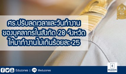 ข่าวเด่น! ศธ.ปรับลดเวลาและวันทำงานของบุคลากรในสังกัด 28 จังหวัด ให้มาทำงานไม่เกินร้อยละ 25 EZ Webmaster January 4, 2021 เมื่อวันที่ 3 มกราคม 2564 ที่ผ่านมา ปลัดกระทรวงศึกษาธิการ นายสุภัทร จำปาทอง ได้ลงนามประกาศกระทรวงศึกษาธิการ เรื่อง การป้องกันและควบคุมสถานการณ์การแพร่ระบาดของโรคติดเชื้อไวรัสโคโรนา 2019 (COVID-19) โดยการปรับลดเวลาและวันทำงานของบุคลากรในสังกัดและในกำกับของกระทรวงศึกษาธิการ โดยมีเนื้อหา ดังนี้…