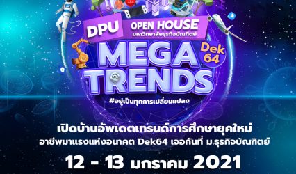 นักเรียน ม.ธุรกิจบัณฑิตย์ (DPU) เปิดบ้านอัพเดตเทรนด์การศึกษา อาชีพแห่งอนาคตในธีม DPU OPEN HOUSE ‘MEGA TRENDS’ อยู่เป็นทุกการเปลี่ยนแปลง EZ Webmaster December 21, 2020 มหาวิทยาลัยธุรกิจบัณฑิตย์ (DPU) เปิดบ้านจัดงาน DPU Open House ‘MEGA TRENDS’ อยู่เป็นทุกการเปลี่ยนแปลง อัพเดตเทรนด์การศึกษายุคใหม่เพื่อรองรับเทรนด์โลกที่เปลี่ยนไป กับ 5 วิทยาลัย และ 6 คณะ ที่จะทำให้น้องๆ ทุกคนเป็นมืออาชีพในทุกเส้นทาง สัมผัสการเรียนการสอนจริงจากทุกคณะ…